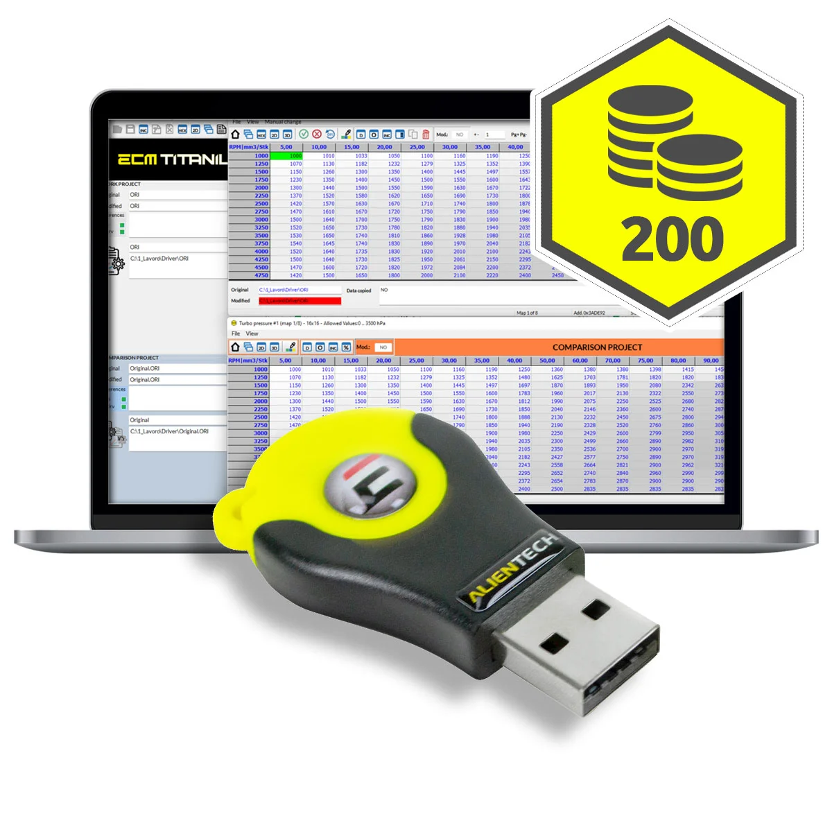 Conjunto de 200 créditos para el software ECM Titanium versión por créditos. Esta es una alternativa más asequible para aquellos que ya tienen un volumen de trabajo constante, ya que les permite trabajar en múltiples vehículos o proyectos sin necesidad de adquirir créditos de manera individual. Esta adquisición garantiza tus reprogramaciones futuras y te permite controlar tus gastos.